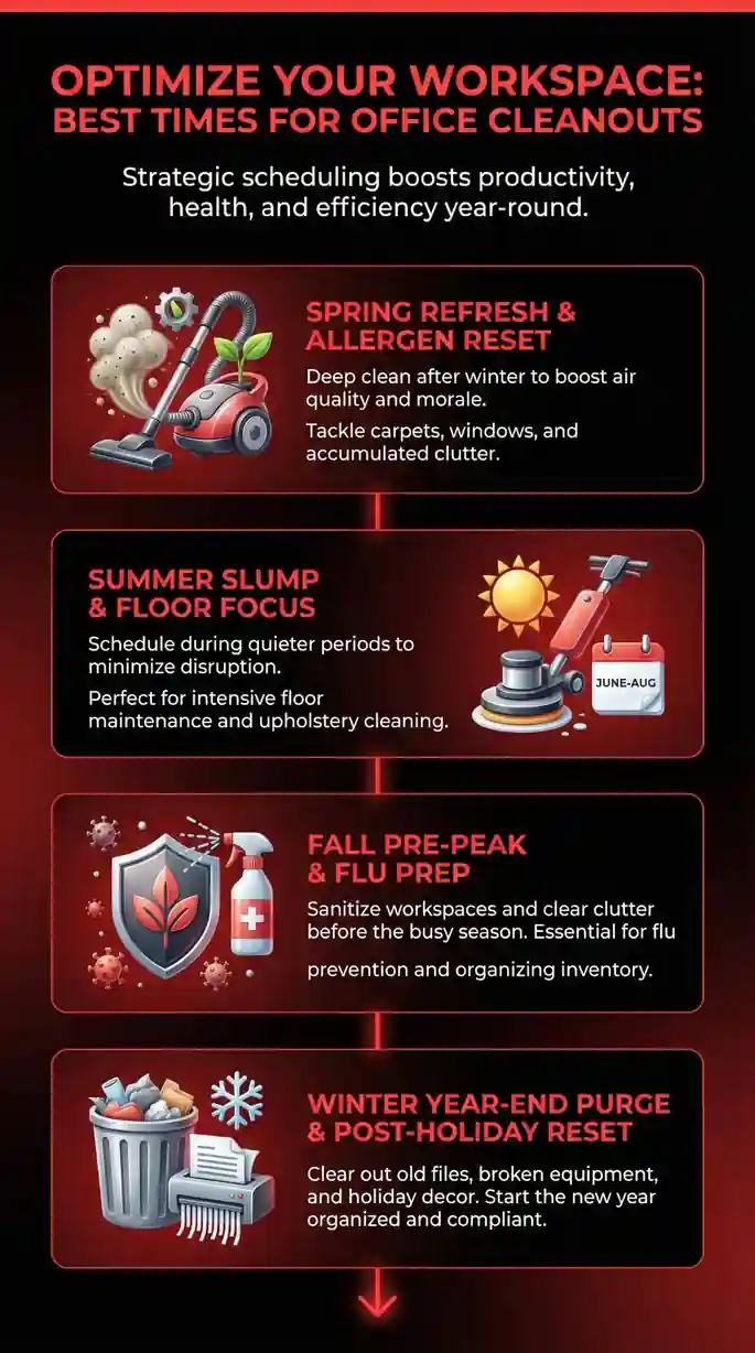 Office cleanout demand follows predictable annual patterns tied to business cycles, fiscal calendars, and commercial lease structures. Understanding these patterns gives you pricing leverage and scheduling flexibility.