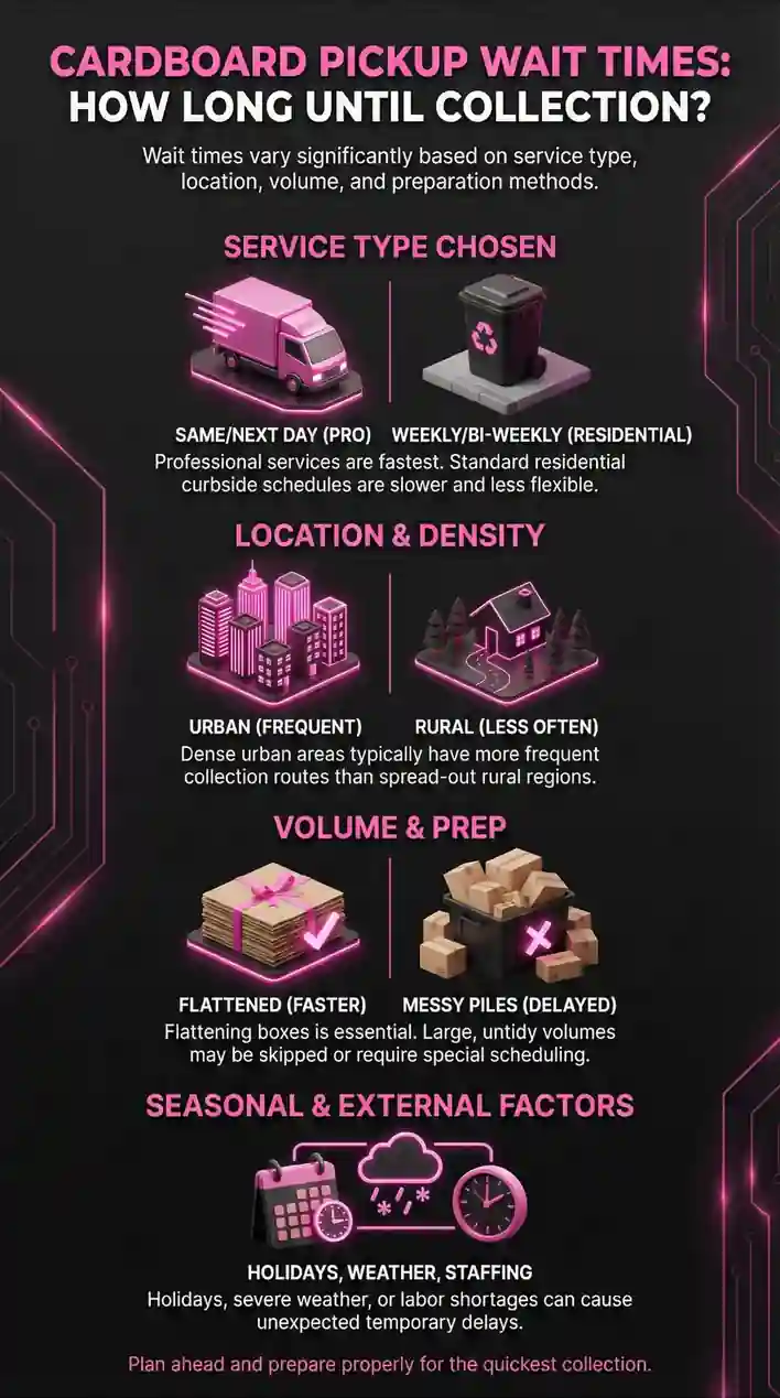 Ready to know your actual wait time? This guide shows what really determines pickup speed, which factors you control, and how to get the fastest slot available when cardboard is taking over your space and a cardboard box pickup service is needed.