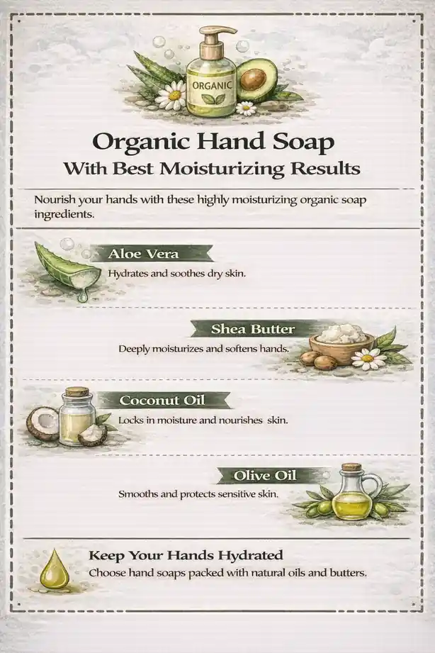 The most effective moisturizing organic hand soaps combine lightweight plant oils, natural glycerin, and gentle cleansers derived from coconut or sugar sources. These ingredients work together to bind moisture to the skin, rinse clean, and avoid buildup. When properly formulated, they hydrate without leaving a greasy film or clogging pores.