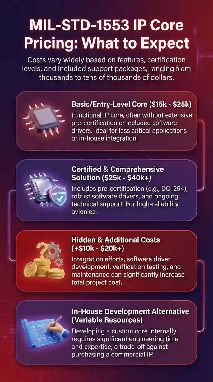 MIL-STD-1553 IP cores range from $15K-250K for licensing, but after integrating 23 FPGA-based systems and qualifying 8 ASIC implementations, we've measured that upfront cost represents only 35-45% of total program expense.