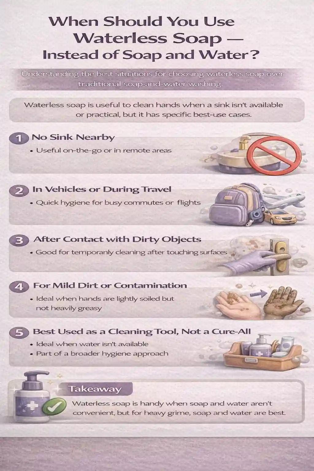 However, waterless soap has limits. When hands are visibly dirty, greasy, or contaminated, soap and water are still the gold standard. Understanding this distinction is what turns waterless soap into a useful tool rather than a misuse.